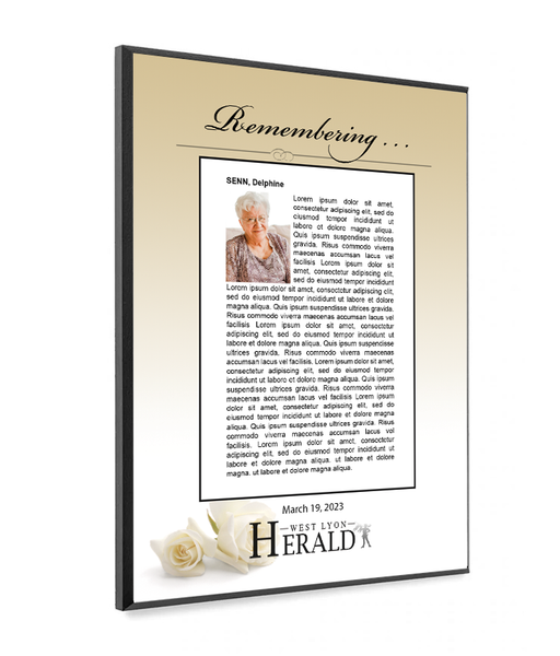 Our memorial plaques are a wonderful way to remember and celebrate the life of your loved one. The obituary that was posted can be displayed on our beautiful plaque, made of high-quality materials and printed with UV inks for stunning color and detail. We'll send you a proof prior to production so you can be sure that the finished product is perfect.